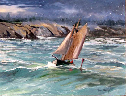 Evern "Earl" Bailly (1903 – 1977) was a lifelong Lunenburg artist with an impressive list of artistic accomplishments and an engaging personality. Stricken with polio at the age of two, he lost the use of both his arms and legs. His parents traveled the maritimes seeking out medical experts and experimental therapies, but it was soon clear his paralysis was a permanent condition. His mother, a school teacher, taught Earl to hold a pencil in his mouth and write. Spurred by an unquenchable love of the sea, nature, and the fishing life of his community, he then learned to paint with a brush clenched in his teeth, developing a remarkable talent for painting. He also mastered linoleum block prints with tools adapted by his brother, Don Bailly.